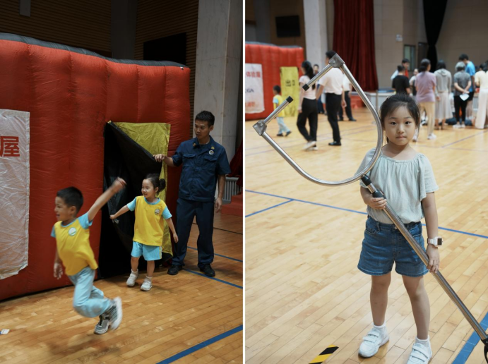 在消防装备体验环节,大家首先来到消防救援装备展区,近距离接触灭火防护服、消防水枪等设备。随后,在专业人员的讲解下认识消防装备,并走进消防体验屋进行模拟逃生演练。小朋友们也穿上了消防队贴心准备的小消防服和小水枪,化身“小小消防员”。